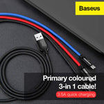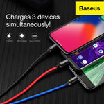 Baseus 3-in-1 Nylon Braided Fast Multi Charging USB (with IP/Android/Type-C pins) Data Cable SIMULTANEOUS CHARGING - This cable is designed to solve the problem of charging 3 devices simultaneously at...